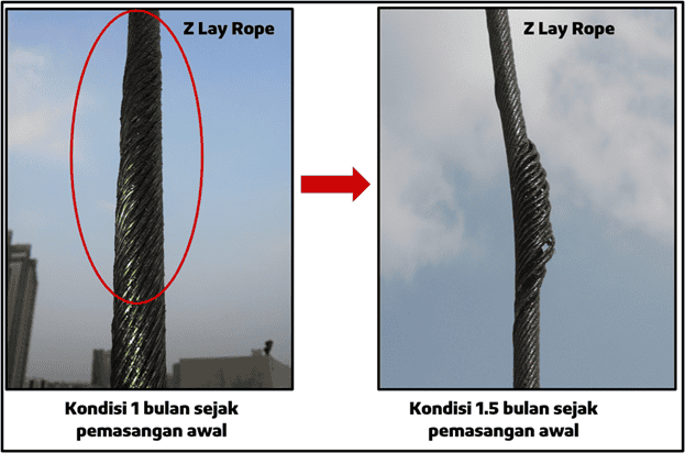 Deformasi pada Wire Rope Baru Putaran Kiri sehingga umur pakai sangat singkat hanya kurang dari 1 minggu sejak pemasangan awal.